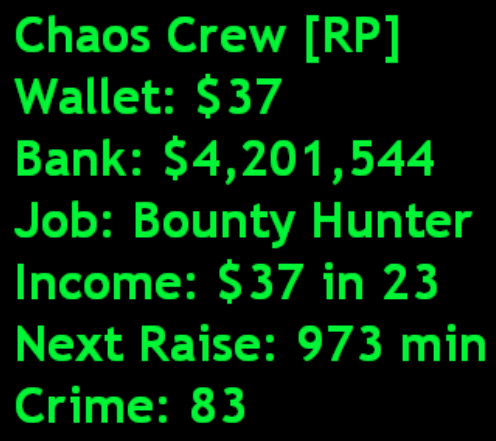 / rprank = Displays your rank in money and hours spent online compared to other online players